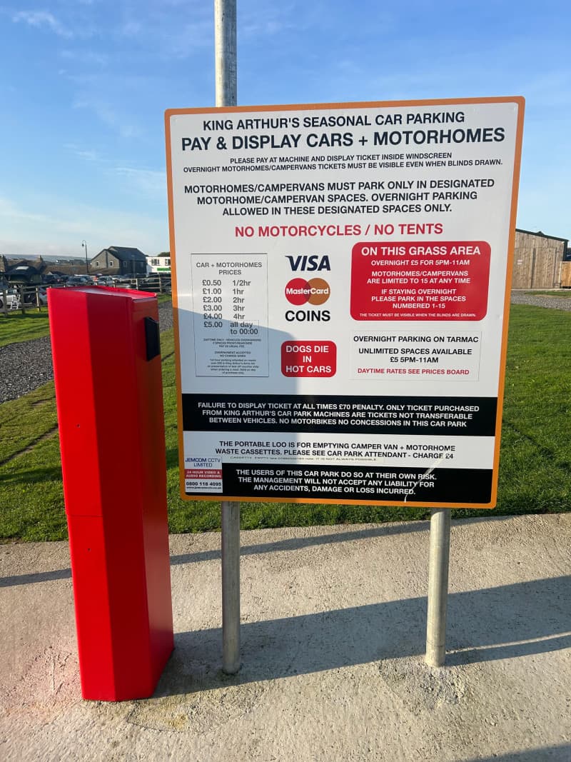 This location is conveniently situated within a short stroll of all the area's attractions. It is adjacent to the King Arthur's Arms. The overnight parking fee is 8, applicable from 6pm to 10am, with reduced rates available during the off-season. Please note that daytime parking fees are also in effect. Guests have the option to park on either tarmac or a grassy area, and a spacing of 5 meters between vehicles is required. Expect this spot to be particularly bustling during the summer months.